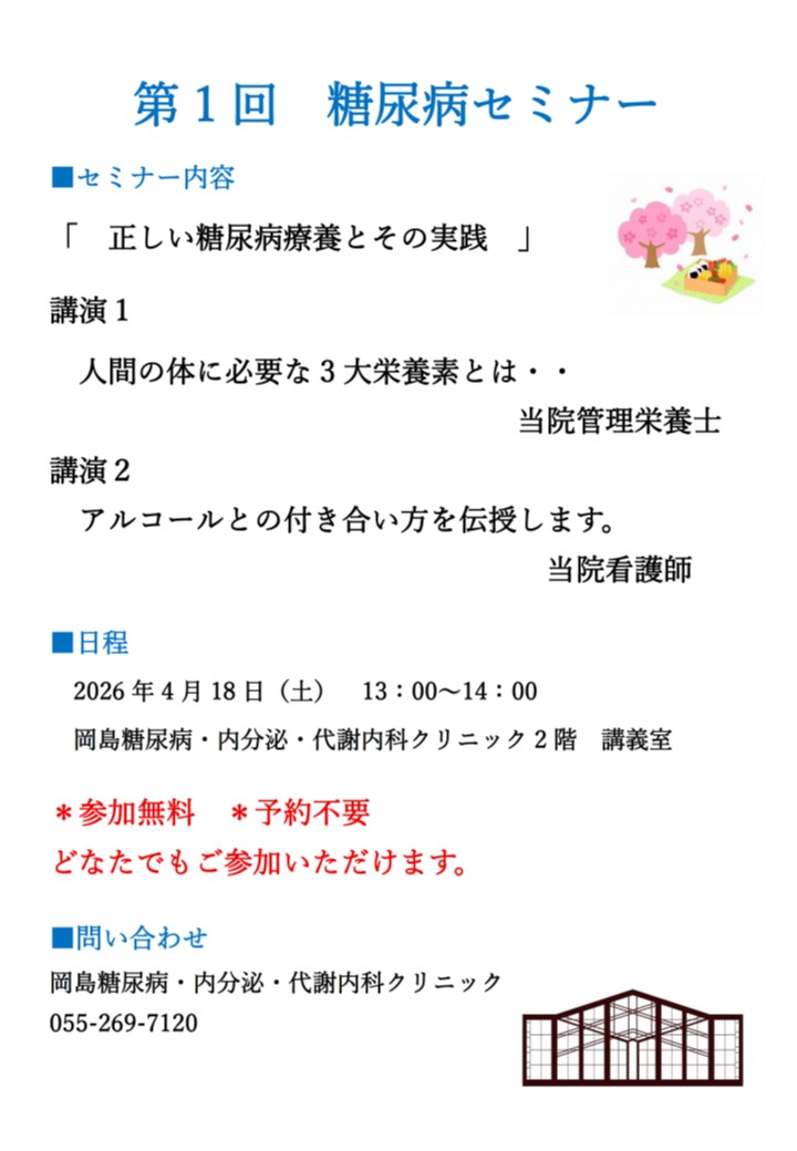 第1回糖尿病セミナーのお知らせ 2026.03.23 第1回糖尿病セミナーを開催いたします。今回は「正しい糖尿病療養とその実践」と題して当院管理栄養士と看護師よりお話をさせていただきます。参加無料、予約不要でどなたでもご参加いただけます。皆様のご参加を心からお待ちいたしております。