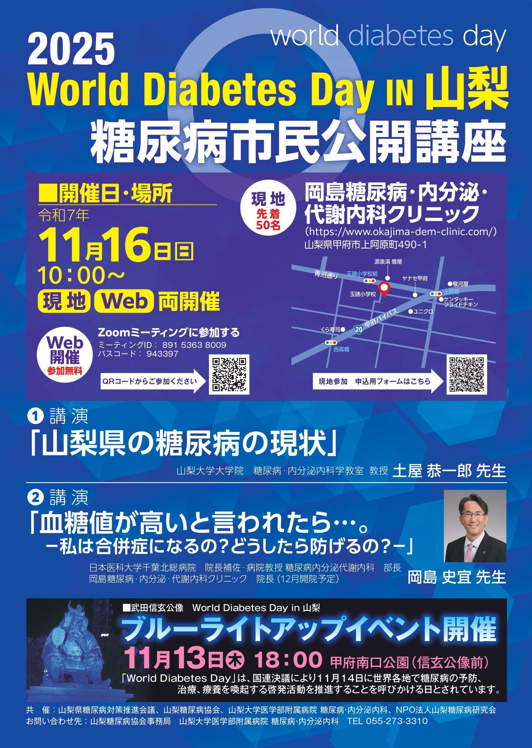 | 開催場所 | 岡島糖尿病内分泌代謝内科クリニック 山梨県甲府市上阿原町490-1 現地参加 申し込み用フォームはこちら |